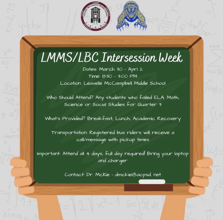 The Spring Intersession for Intervention and Enrichment is scheduled to begin on Monday, March 30 and will conclude on Thursday, April 2. Students attending Spring Intersession will attend next week, Monday-Thursday; students not attending Intersession will not attend school. Please visit the Intersession information on our website at www.acpsd.net/intersession, which includes district- and community-sponsored opportunities.